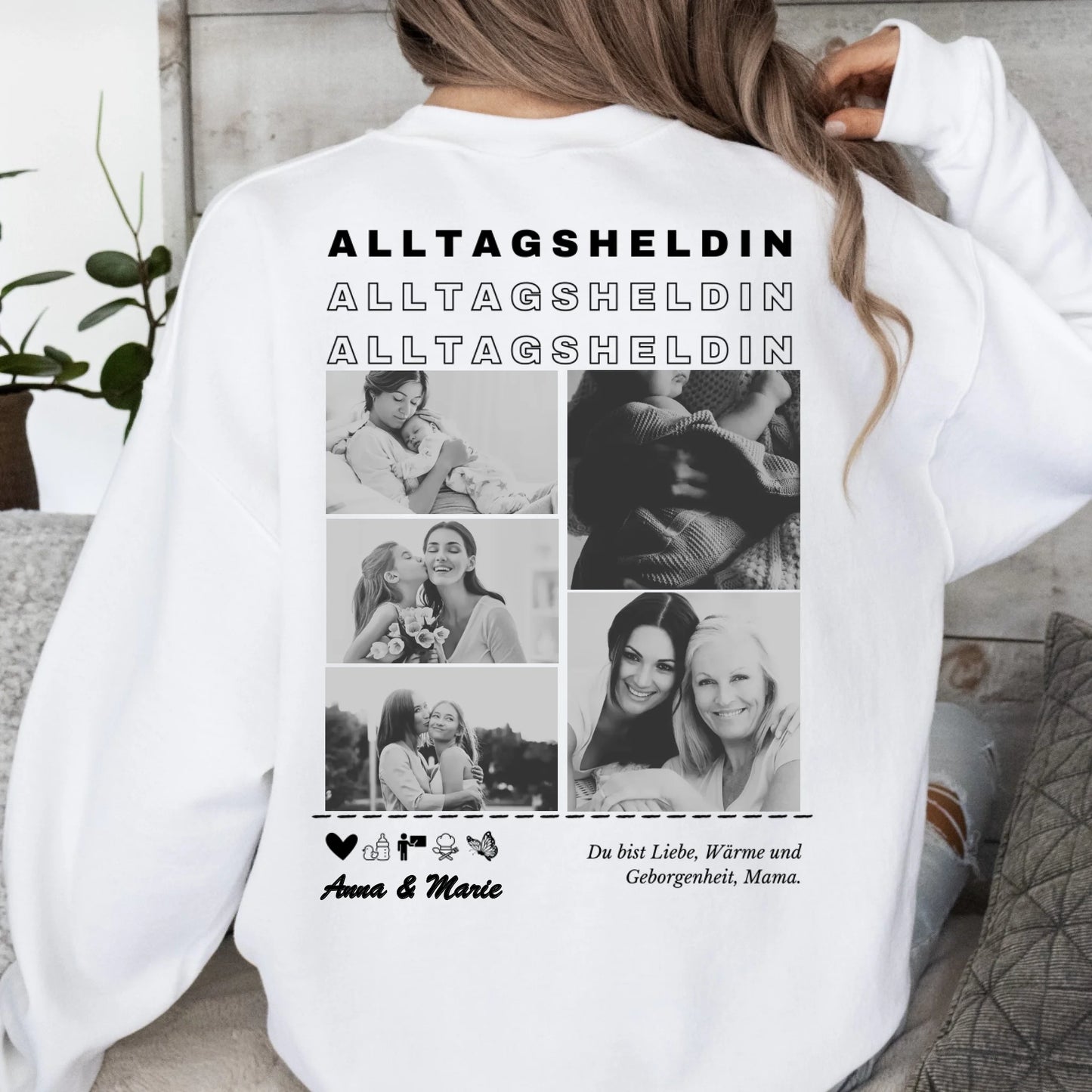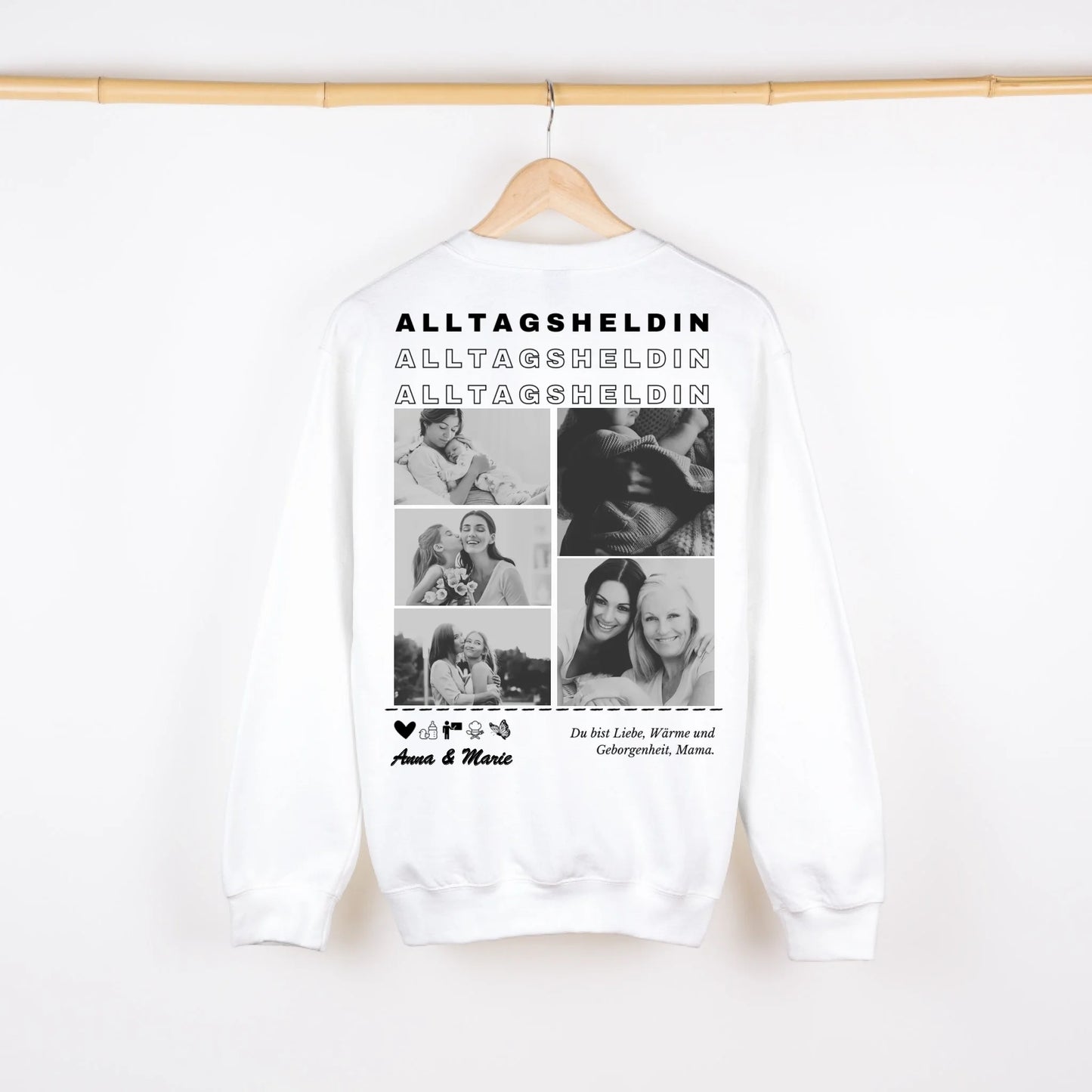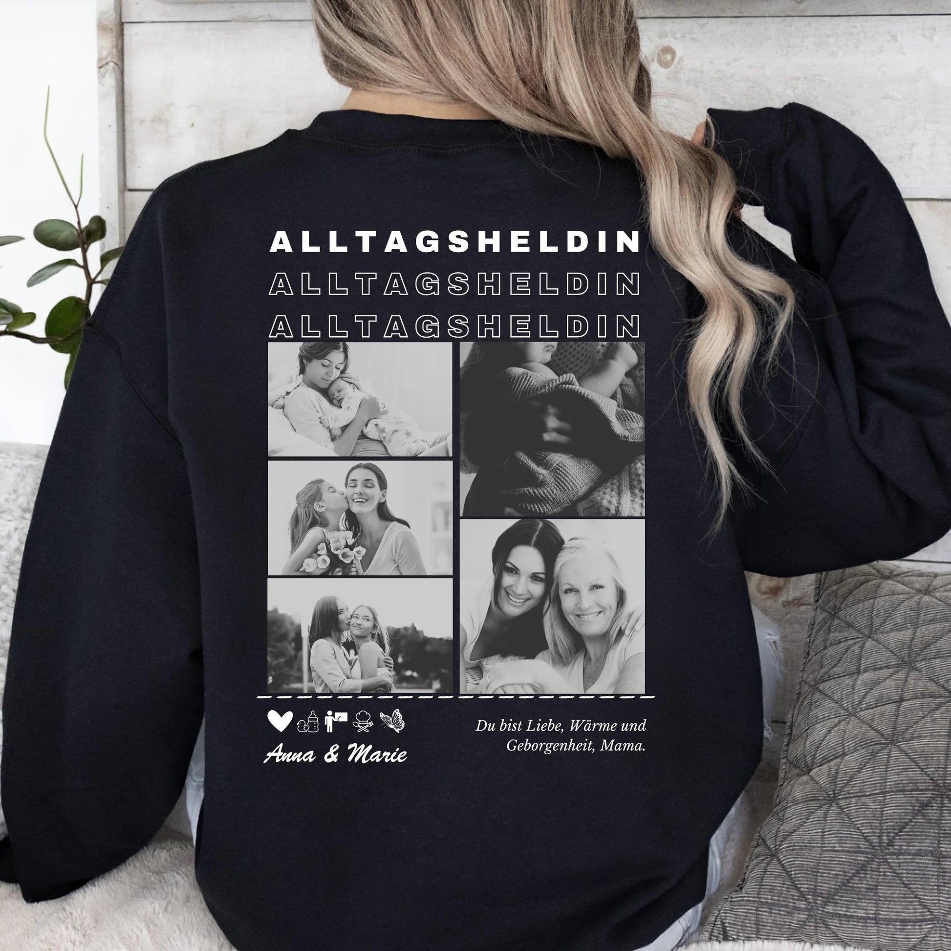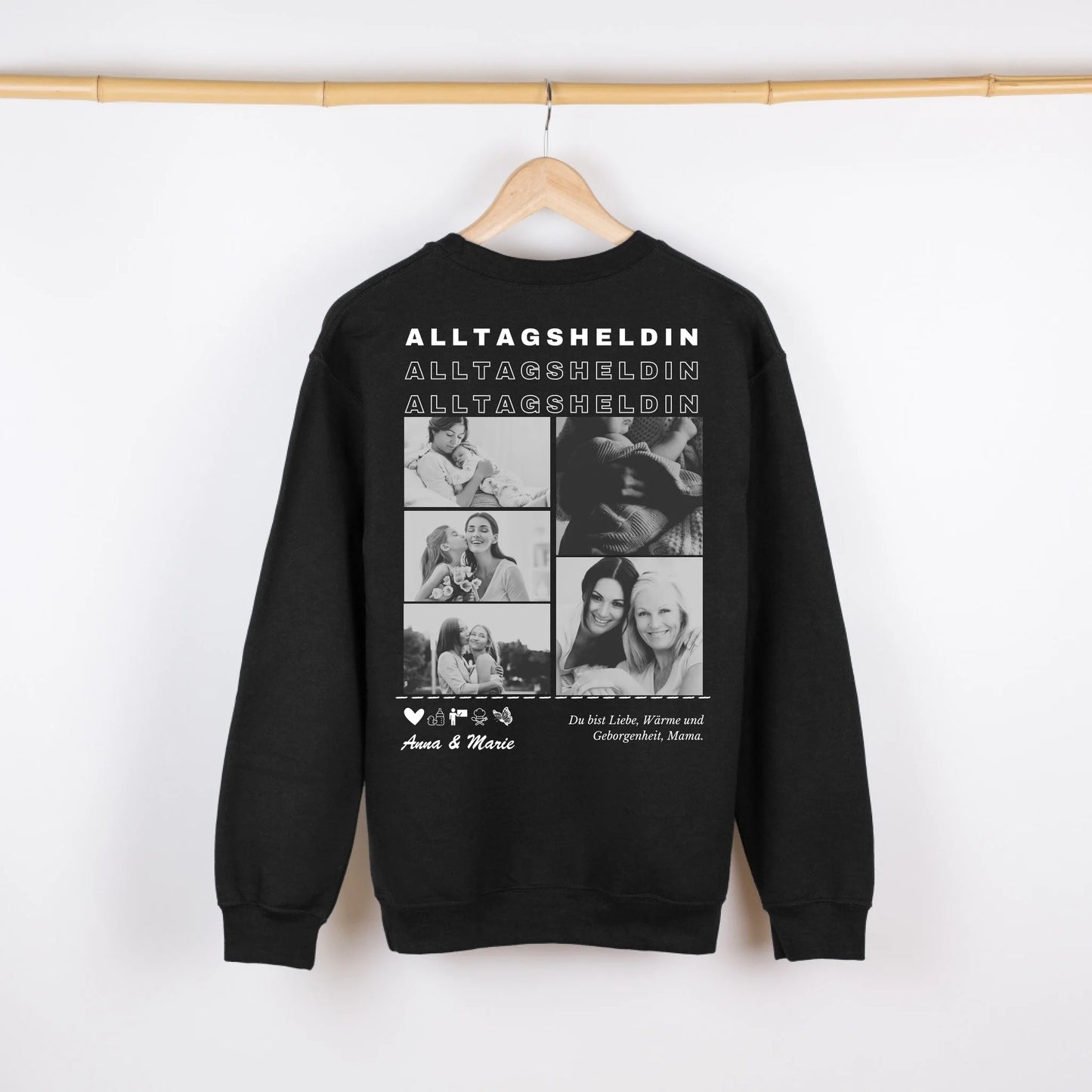 Alltagsheldin Mama - Personalisierter Foto Sweater (Schwarzes Crewneck Sweatshirt, Unisex) Für Mutter, Partnerin, Oma